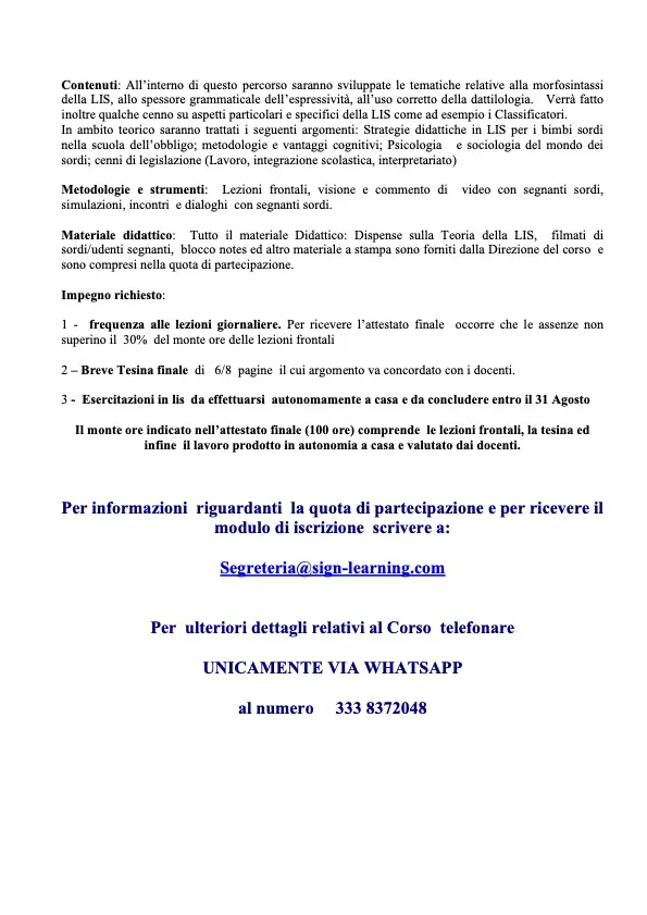 E' possibile assistere a singole lezioni del Corso per Assistente alla Comunicazione versando una quota di partecipazione. Per iscriversi inviare una mail a segreteria@sign-learning.com, oppure compilare la richiesta nella sezione contatti.